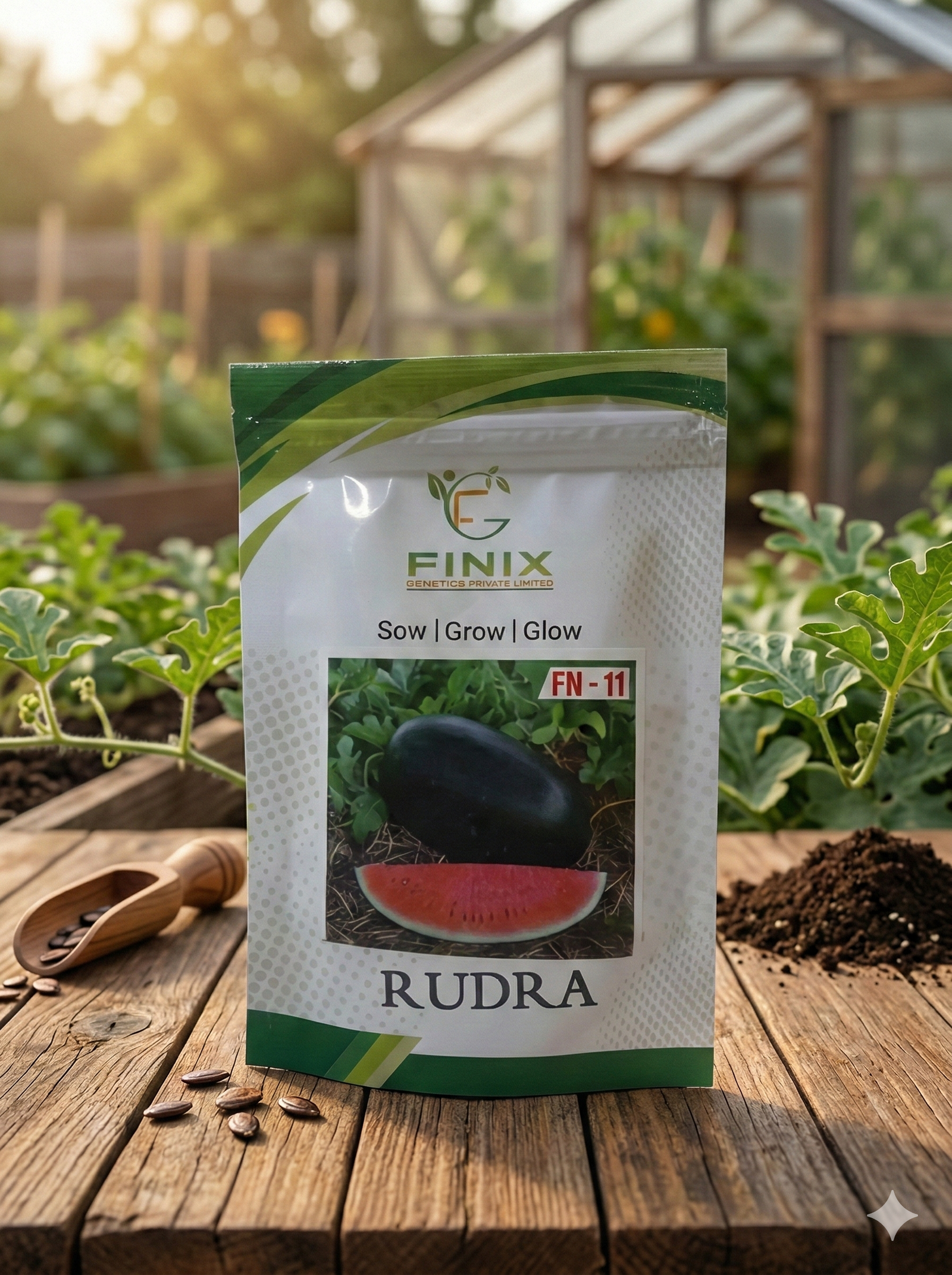 Finix Genetics Pvt. Ltd. brings you Rudra, a premium F1 hybrid variety of watermelon seeds known for its exceptional performance and high market appeal. Developed with precision for Indian climatic conditions, these seeds are perfect for commercial farming, offering reliable results consistently. Rudra ensures uniform fruit size, incredible sweetness, and robust plant vigor, making it the preferred choice for both farmers and traders seeking high-quality produce.